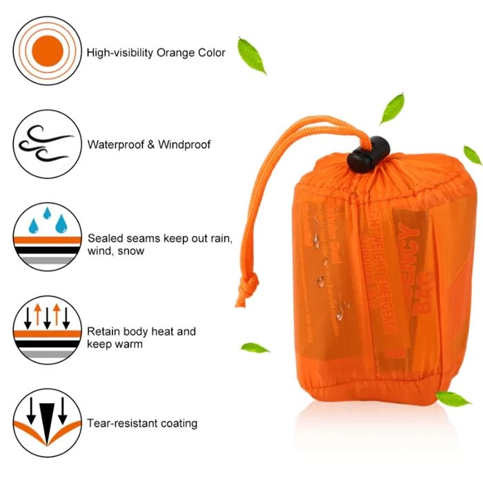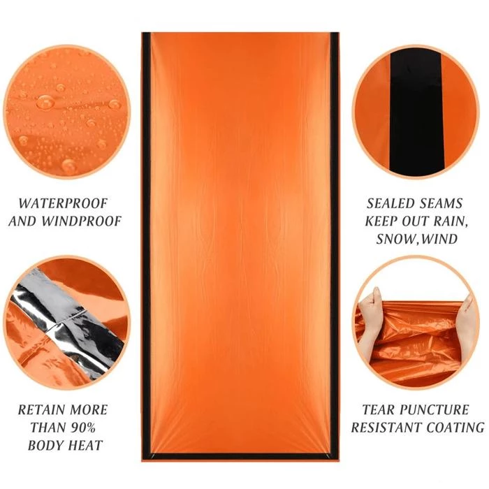 - Waterproof & Windproof: Keeps rain and wind out, effectively protecting you from the elements. And unlike other emergency sleeping bags, it also features completely taped seams which creates an impenetrable barrier between you and what could kill you.